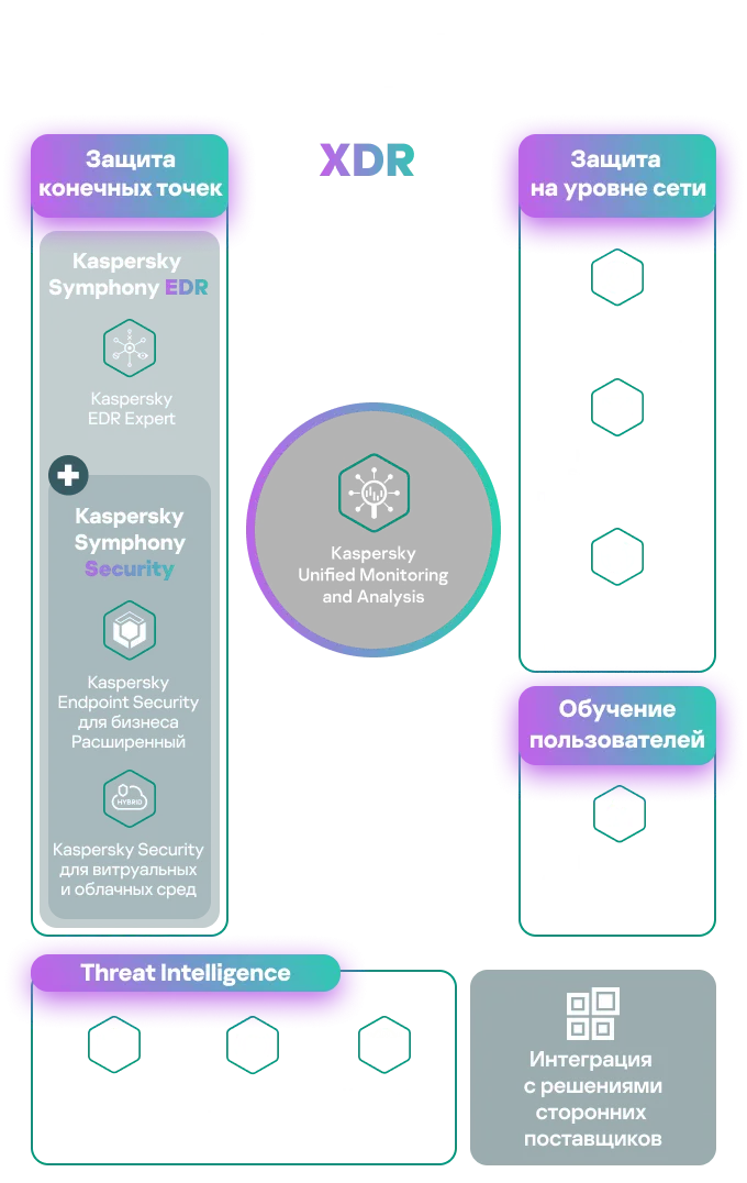 В состав решения входят передовая защита рабочих мест, серверов, виртуальных машин, сетевого и почтового трафика, а также повышение осведомленности сотрудников и возможность легко встраиваться в текущую ИБ-систему. Все элементы платформы взаимосвязаны между собой, дополняют друга и входят в одну лицензию.